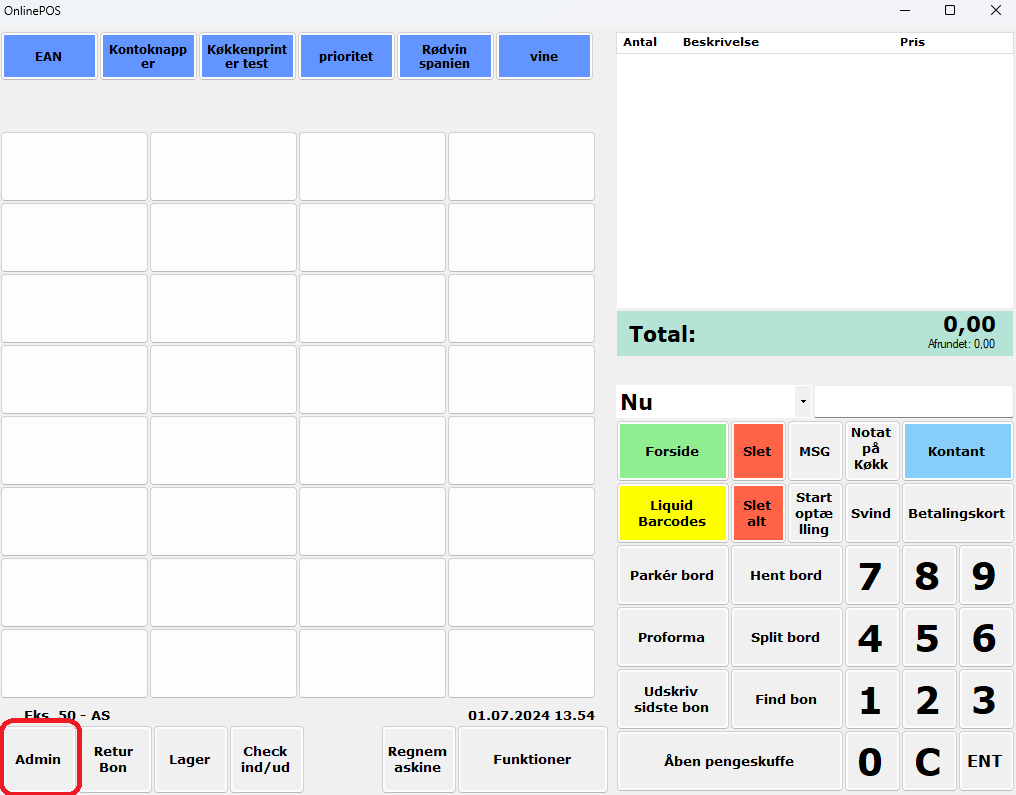 Åbn OnlinePOS -> tryk på 'admin' i bunden til venstre